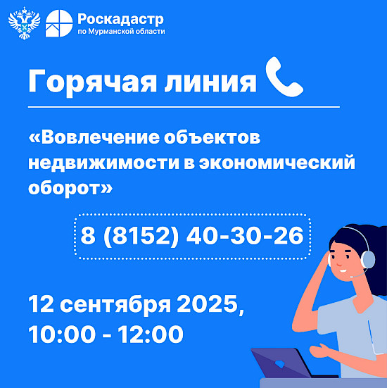 12 сентября 2025 года с 10:00 до 12:00 пройдет горячая линия, посвященная вопросам пилотного проекта «Вовлечение объектов недвижимости в экономический оборот» территории г.п. Кильдинстрой и Мурмаши Кольского района Мурманской области.